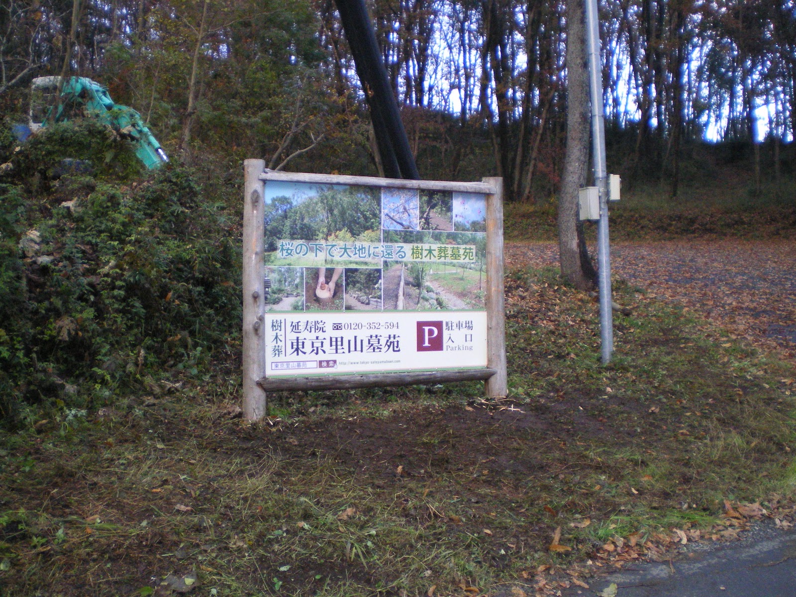 東京里山墓苑では、駐車場入口に樹木葬の看板を取り付け致しました。お車で来苑の際は、お寺前を過ぎて、樹木葬看板を目印にお越しください。