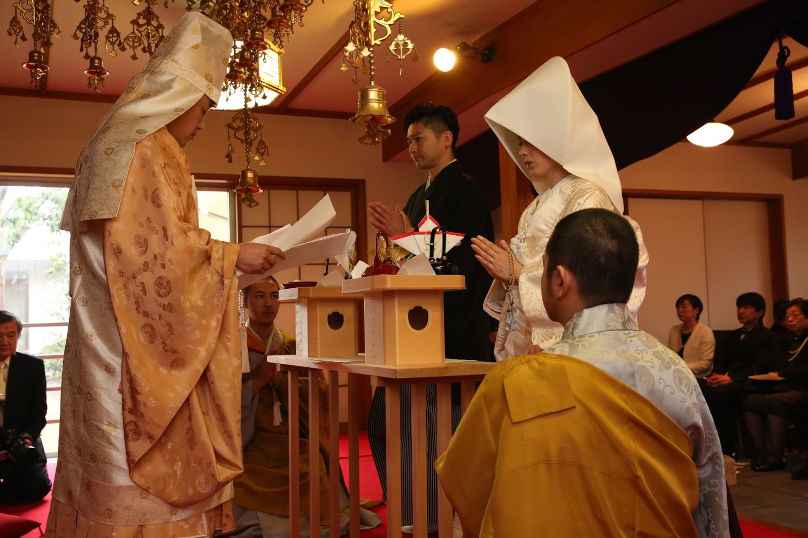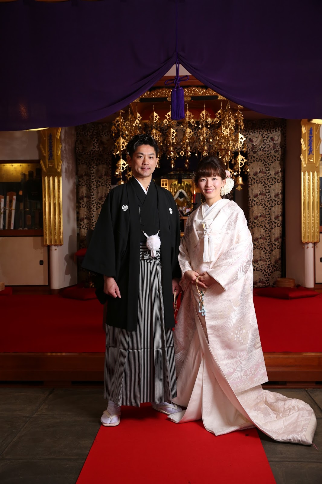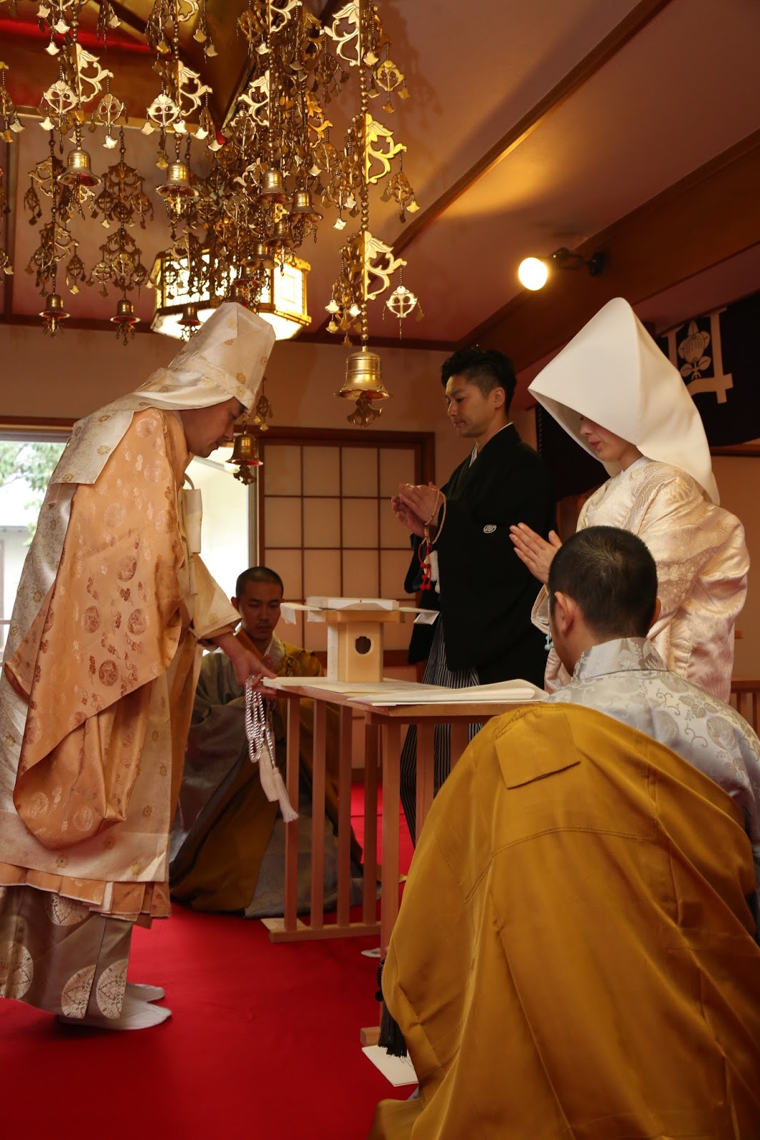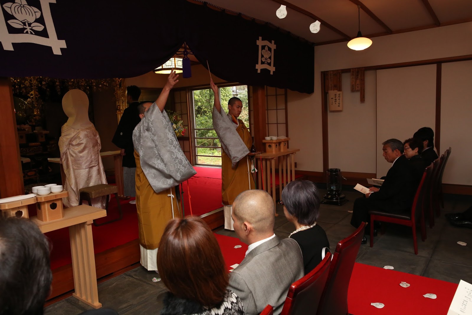 桜満開の季節に、大沢・谷本家結婚式が執り行われました。式長は、日蓮宗延寿院第31世住職及川一晋上人が務めさせて頂きました。午前中はあいにくの空模様でしたが、優しい雨がお二人を祝福しているかのような素敵な一日でした。