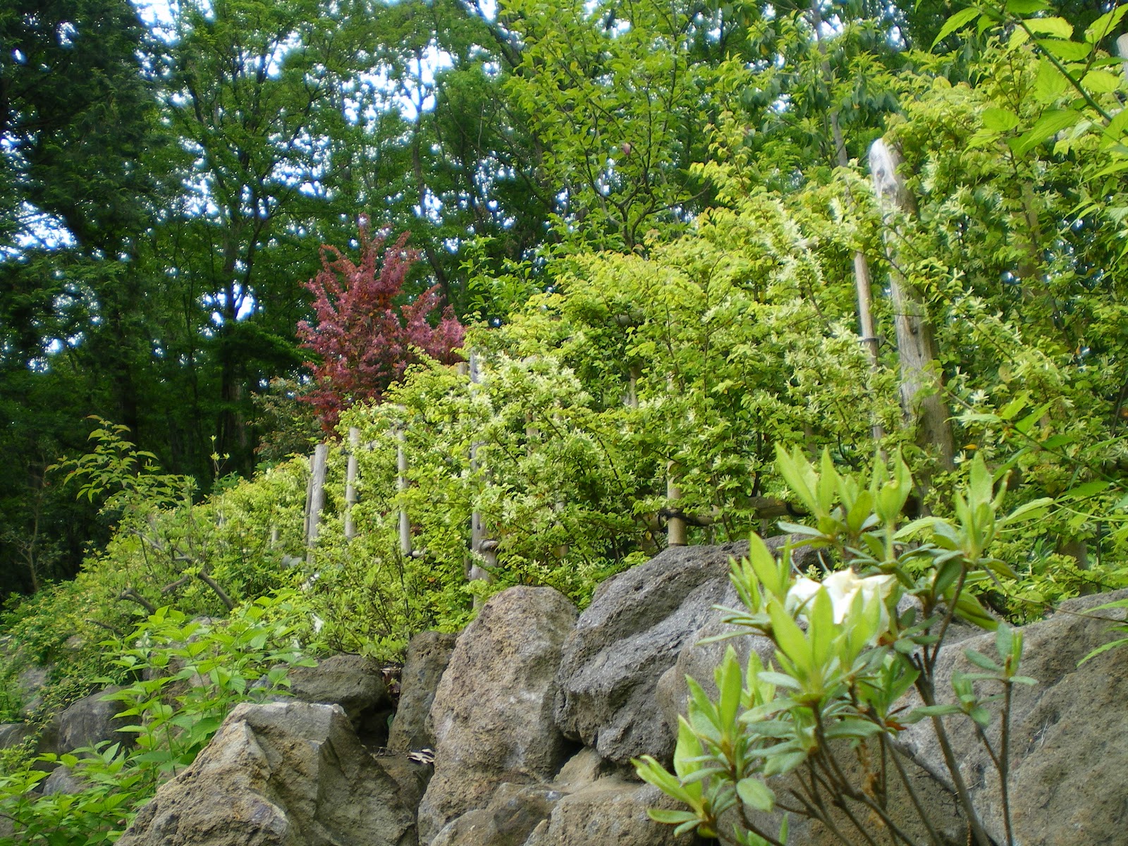 東京里山墓苑では曇天模様の空の下、テッセンが開花しました。この写真よく見て観て下さい。お気づきになられましたか?そうなんです、テッセンの花には蟻とキリギリスが仲良く写っているんです。なんという偶然!怠ることなく里山を保全しなさいという暗示かもしれませんね。石垣沿いに咲くトキワマンサクの写真を添えてお伝えさせて頂きます。