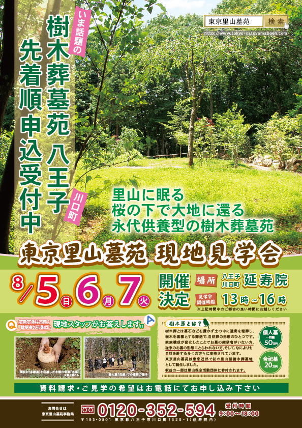 樹木葬八王子現地見学会 2012.07.262022.02.04 東京里山墓苑より、2012年8月5、6、7日の3日間連続で樹木葬見学を開催します。 詳しくは東京里山墓苑HP⇒http://tokyo-satoyamaboen.com/
